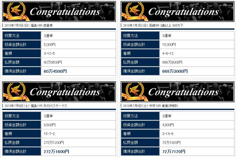 ビギナーの有料情報は一番安くても3万円。投資金額は5,000円で1レース的中した場合の配当金は60万円~150万円ということなので、昇格するには10回ほど的中しないと昇格できない計算になります。