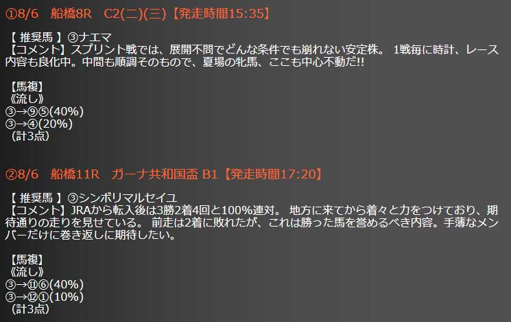今日8/6の船橋競馬の予想は船橋8Rで馬複流しの3点と船橋11Rのガーナ共和国盃で馬複流しの3点となっています。