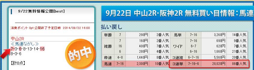 9/14~9/28の間で的中した無料情報が掲載されていたようなのですが、馬連でも投資金額次第では万馬券が取れるような情報でした。