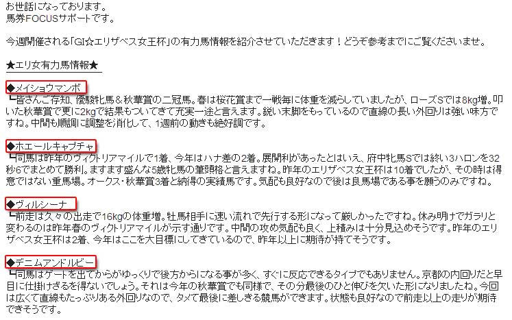 『馬券フォーカス』は会員の評判が良いということでこちらのサイトでもよく紹介しているサイトなのですが、エリザベス女王杯の有力馬情報がメールで届いたので、内容をチラッとだけ紹介しようと思います!